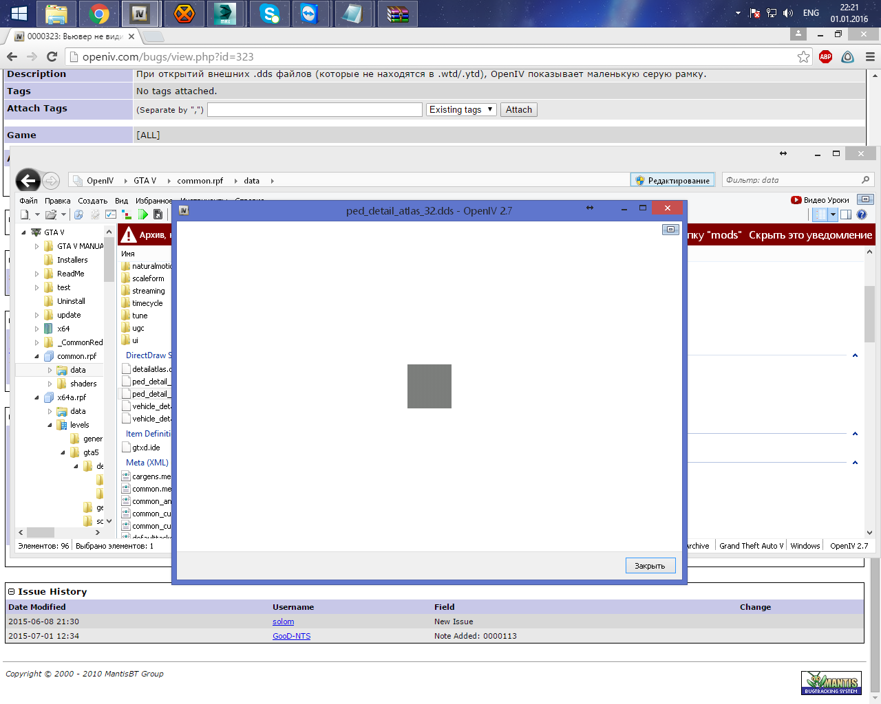 | Description | При открытий внешних .dds файлов (которые не находятся в .wtd/.ytd), OpenIV показывает маленькую серую рамку. | ||||