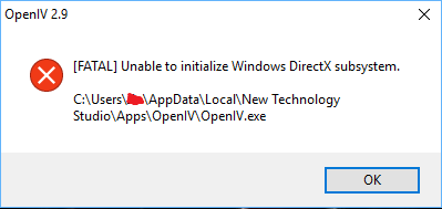 | Description | Whenever I try to start OpenIV I get the following error message: [FATAL] Unable to initialize Windows DirectX subsystem. C:\Users\(me)\AppData\Local\New Technology Studio\Apps\OpenIV\OpenIV.exe I've tried reinstalling, uninstalling and removing all previous versions, I'm getting this for absolutely no reason whatsoever. How do I fix it? | ||||