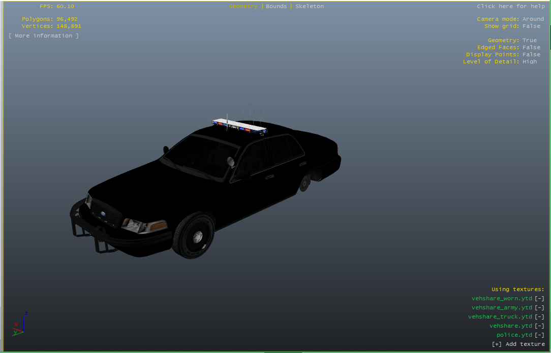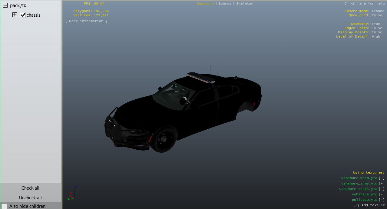 | Description | Model Viewer is not showing any vehicle skins when they are present in the .ytd files. All other textures are working, its specifically only the vehicles skins that aren't loading its only showing a black car for any model. I will attempt to uninstall and reinstall OpenIV and I hope it works from there. | ||||
