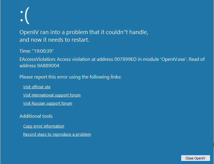 | Description | The title says it all. After updating OpenIV it no longer opens and gives an error message. The previous version worked fine but update killed it. Error log below: Time: "18:48:50" Type: "EAccessViolation" Message: "Access violation at address 007899ED in module 'OpenIV.exe'. Read of address 9AB89004" [Windows] TErrorWindow=OpenIV - Application error [Exeption] Exe: 4.0.0.1400 3/5/2020 Address: 0x007899ED ClassName: EAccessViolation MessageText: Access violation at address 007899ED in module 'OpenIV.exe'. Read of address 9AB89004 | ||||