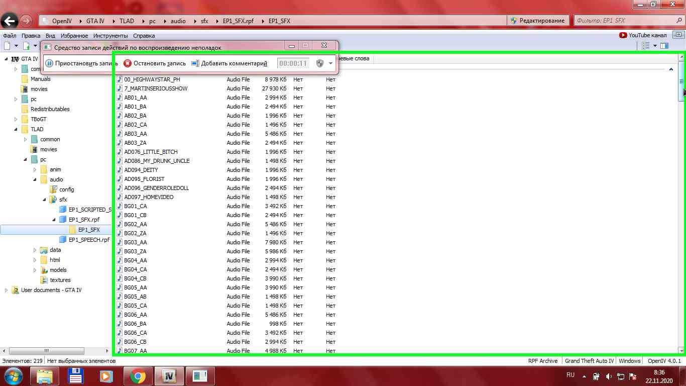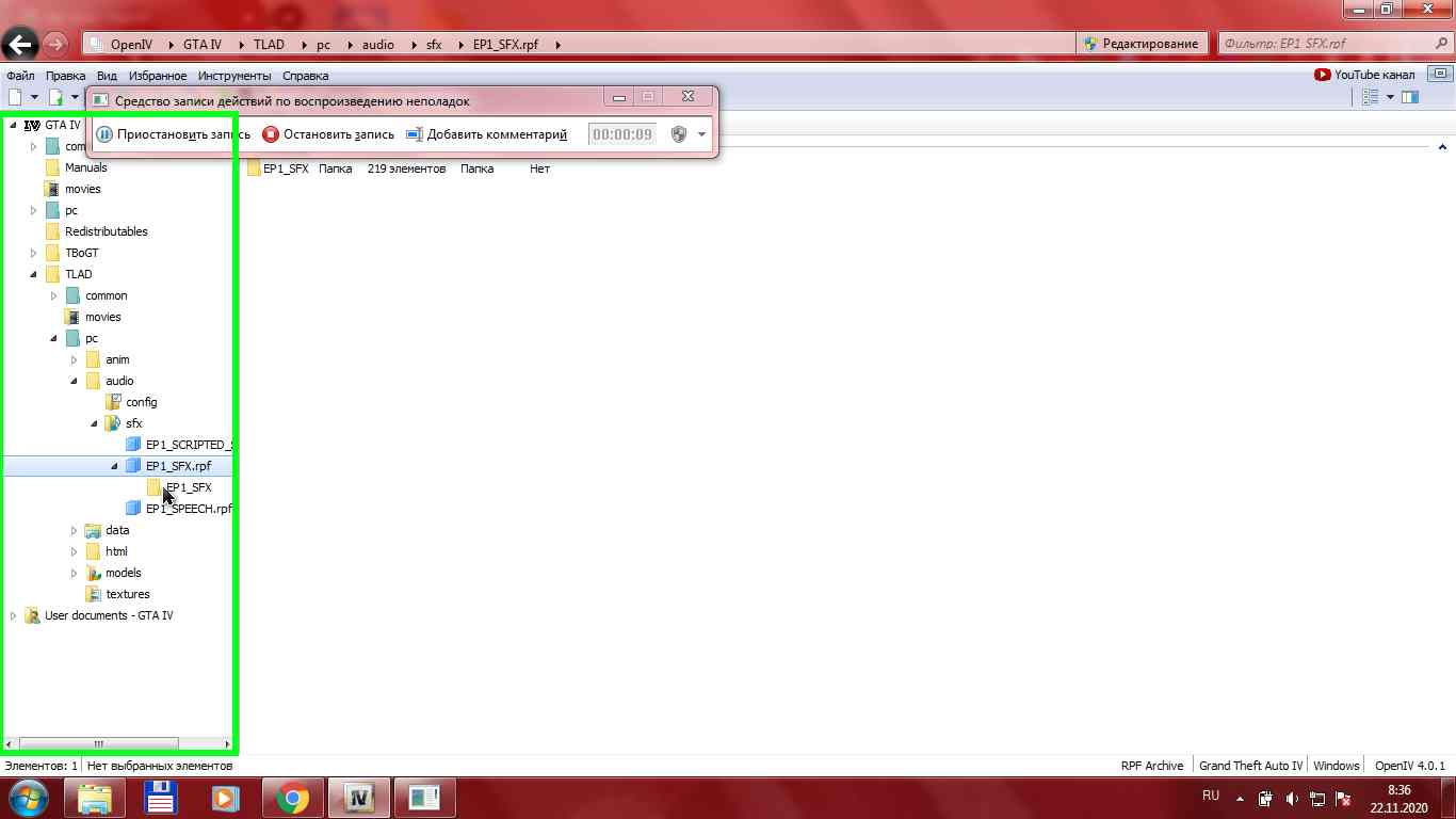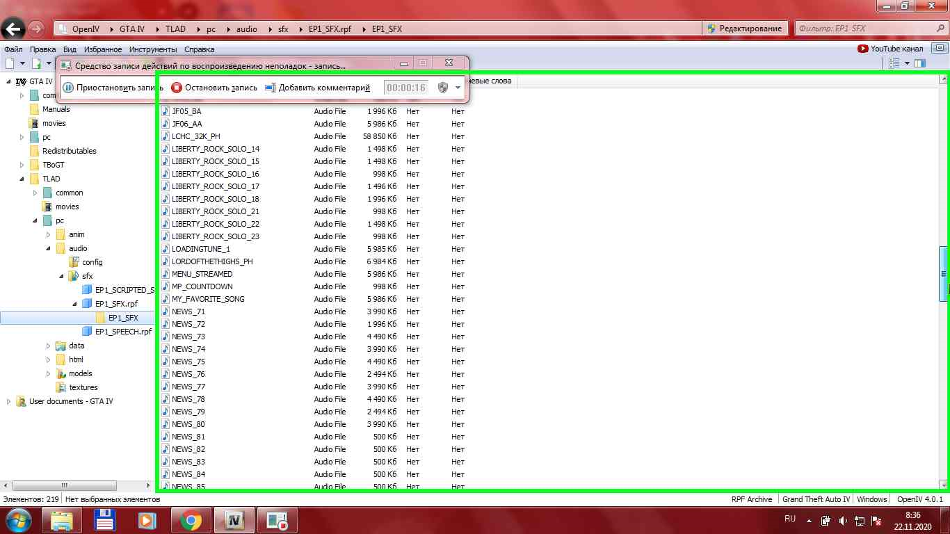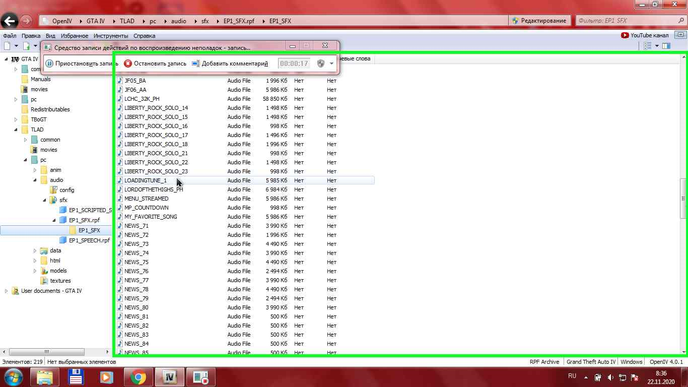 | Steps To Reproduce | Problem Step 1: (11/22/2020 8:35:57 AM) User left-click "TLAD (structure element)" in "OpenIV - GTA IV - [Reading Mode]" Problem Step 2: (11/22/2020 8:35:58 AM) User left-click "pc (structure element)" in "OpenIV - GTA IV - [Reading Mode]" Problem Step 3: (11/22/2020 8:36:00 AM) User left-clicked "audio (structure element)" in "OpenIV - GTA IV - [Reading Mode]" Problem Step 4: (11/22/2020 8:36:01 AM) User left click on "sfx (structure element)" in "OpenIV - GTA IV - [Reading Mode]" Problem Step 5: (11/22/2020 8:36:02 AM) User left-clicked "EP1_SFX.rpf (structure element)" in "OpenIV - GTA IV - [Reading Mode]" Problem Step 6: (11/22/2020 8:36:03 AM) User left click on "EP1_SFX (structure member)" in "OpenIV - EP1_SFX.rpf - [Reading Mode]" Problem Step 7: (11/22/2020 8:36:05 AM) Start user dragging to "Position (Indicator)" in "OpenIV - EP1_SFX.rpf - [Read Mode]" Problem Step 8: (11/22/2020 8:36:11 AM) Completion of user drag to "Position (indicator)" in "OpenIV - EP1_SFX.rpf - [Read Mode]" Problem Step 9: (11/22/2020 8:36:12 AM) User double-clicked "LOADINGTUNE_1 (list item)" with the left mouse button in "OpenIV - EP1_SFX.rpf - [Reading Mode]" Previous Next Problem Step 10: (11/22/2020 8:36:18 AM) User double-clicked "LOADINGTUNE_1 (list item)" with the left mouse button in "OpenIV - EP1_SFX.rpf - [Reading Mode]" | ||||