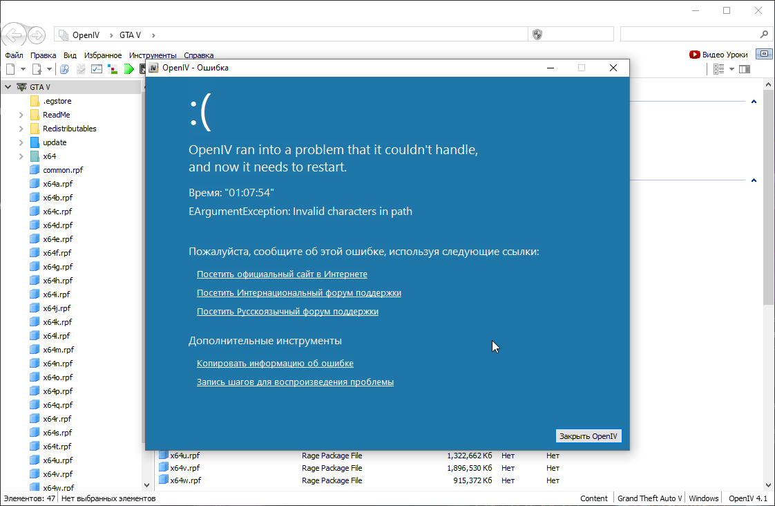 | Description | When I run OPEN IV and enter the file name in the search box, this error pops up and the program closes. I also noticed that it seems like the changes made through open IV do not work in the game. (I tried to replace the minimap and all the files were successfully replaced, but these changes are not in the game). | ||||