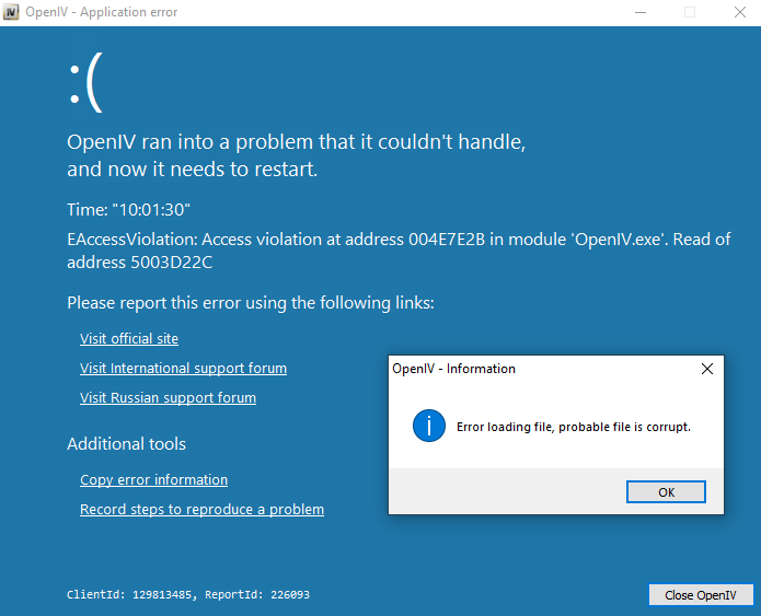 | Additional Information | Time: "10:01:30" Type: "EAccessViolation" Message: "Access violation at address 004E7E2B in module 'OpenIV.exe'. Read of address 5003D22C" Additional information: [Context] App::Temp=C:\Users\Owner\AppData\Local\Temp\OpenIV_08171330\ Main::ExploreArchiveNode::WorkItem=C:\Program Files (x86)\Steam\steamapps\common\Grand Theft Auto V\ GetSystemDefaultLangID=1033 SysLocale={ DefaultLCID: "1033", PriLangID: "9", SubLangID: "1", FarEast: "True", MiddleEast: "True" } App::Path=C:\Users\Owner\AppData\Local\New Technology Studio\Apps\OpenIV\ GetThreadLocale=1033 (0x0409) Game::Platform=pc Main::ExploreArchiveNode::ParentArchive=C:\Program Files (x86)\Steam\steamapps\common\Grand Theft Auto V\ ApplicationPath=C:\Users\Owner\AppData\Local\New Technology Studio\Apps\OpenIV\ OS=Windows 10 (Version 10.0, Build 0, 64-bit Edition) Game::ID=Five (GTA V) GetSystemDefaultLCID=1033 WebClientId=129813485 App::Lang=en_GB Game::Path=C:\Program Files (x86)\Steam\steamapps\common\Grand Theft Auto V\ [Windows] TErrorWindow=OpenIV - Application error TErrorWindow=OpenIV - Application error TErrorWindow=OpenIV - Application error TPreloaderWindow=OpenIV 4.1 TActionsModule=ActionsModule TMainWindow=OpenIV - GTA V - [Read only mode] TRageDrawableWindow=happyhour_neon.ydr - OpenIV Model Viewer TErrorWindow=OpenIV - Application error [Exeption] Exe: 4.1.0.1502 1/21/2022 Address: 0x004E7E2B ClassName: EAccessViolation MessageText: Access violation at address 004E7E2B in module 'OpenIV.exe'. Read of address 5003D22C ClientId: 129813485, ReportId: 226111 | ||||