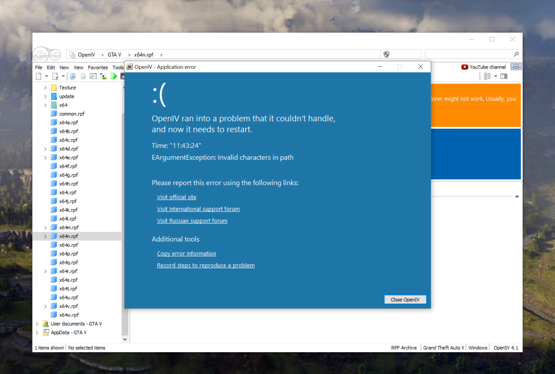 | Description | every time I use the search bar and type in a file name or cs4_14 etc. I get a window popping up telling me to restart openiv. ive tried doing it and it keeps doing the same thing. this has never happened before when searching for stuff ive uninstalled openiv, reinstalled it same thing happens. ive tried cs4_14_hickbar still crash even cs4_14 still crash tried another file name like dt1_14 etc and keeps crash. im out of ideas as this has never happened to me before with openiv | ||||