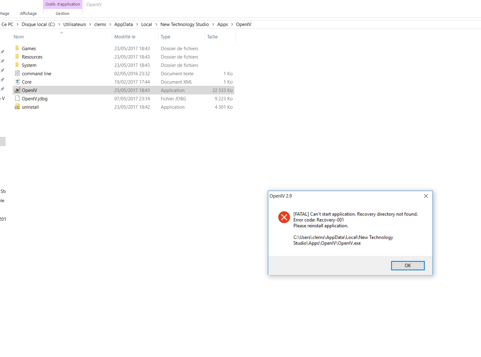 | Steps To Reproduce | I only launch the OVISETUP, the install work, but if i'm supposed to have a screen that confirm the installation. If I agree for launch OIV after installation nothing happen. When i go to : C:\Users\clems\AppData\Local\New Technology Studio\Apps\OpenIV and use OpenIV.exe i've go the error "[FATAL] Can't start application. Recovery directory not found. Error code: Recovery-001. Please reinstall application. C:\Users\clems\AppData\Local\New Technology Studio\Apps\OpenIV\OpenIV.exe " | ||||