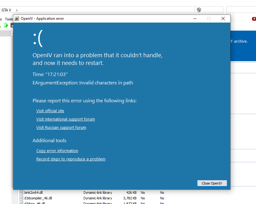 | Description | Time: "17:36:43" Type: "EArgumentException" Message: "Invalid characters in path" Additional information: [Context] App::Temp=C:\Users\Qu33n\AppData\Local\Temp\OpenIV_0092DD0B\ Main::ExploreArchiveNode::WorkItem=E:\Grand Theft Auto V\ GetSystemDefaultLangID=1033 SysLocale={ DefaultLCID: "1033", PriLangID: "9", SubLangID: "1", FarEast: "True", MiddleEast: "True" } App::Path=C:\Users\Qu33n\AppData\Local\New Technology Studio\Apps\OpenIV\ GetThreadLocale=1033 (0x0409) Game::Platform=pc Main::ExploreArchiveNode::ParentArchive=E:\Grand Theft Auto V\ ApplicationPath=C:\Users\Qu33n\AppData\Local\New Technology Studio\Apps\OpenIV\ OS=Windows 10 (Version 10.0, Build 0, 64-bit Edition) Game::ID=Five (GTA V) GetSystemDefaultLCID=1033 App::Lang=en_GB Game::Path= [Windows] TSearchWindow=Search - OpenIV TMainWindow=OpenIV - GTA V - [Read only mode] TActionsModule=ActionsModule TErrorWindow=OpenIV - Application error [Exeption] Exe: 4.1.0.1502 1/21/2022 Address: 0x0050AA74 ClassName: EArgumentException MessageText: Invalid characters in path | ||||